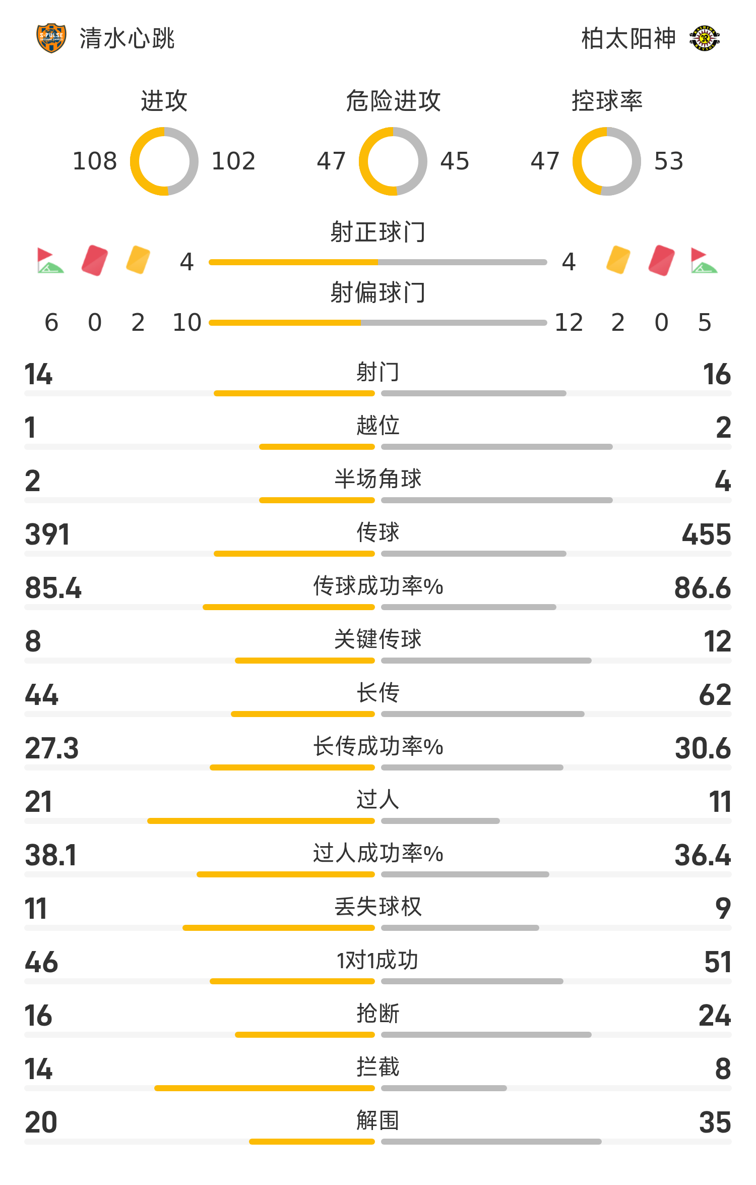 技术统计清水心跳首发阵容:1-冲悠哉;25-布鲁内蒂(83’37-大畑凛生);66-勒肖恩;4-莲川壮大;39-日高春人(68’21-矢岛慎也);7-卡皮沙巴;98-布埃诺;36-宇野禅斗(76’49-小竹知恩);33-乾贵士;23-北川航也(76’15-千叶宽汰);19-松崎快(67’11-中原辉)