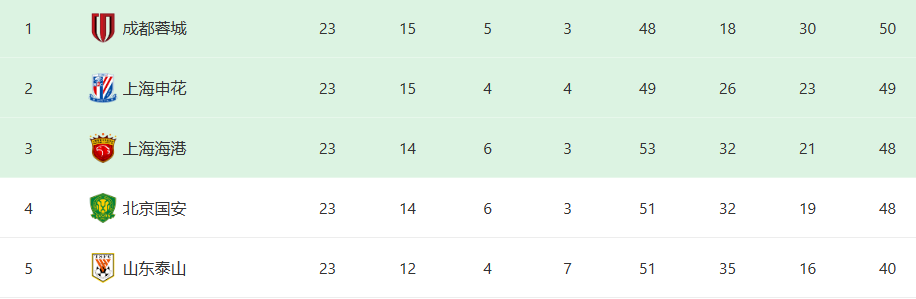在目前的中超积分榜上,成都蓉城积50分,锁定中超榜首之位;而本轮输球的上海申花则积49分,让出榜首之位,位列次席;而排名第三和第四的则是上海海港和北京国安,上海海港积48分;北京国安虽然也同积48分,因为净胜球少的原因,只能屈居第四。